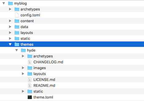 这里,我以 “hyde” 主题为例,介绍主题的安装过程。下载到主题的 zip 文件之后,将其解压到上一步中所创建的网站下的 `themes` 子目录下,形成了如下的文件夹结构: