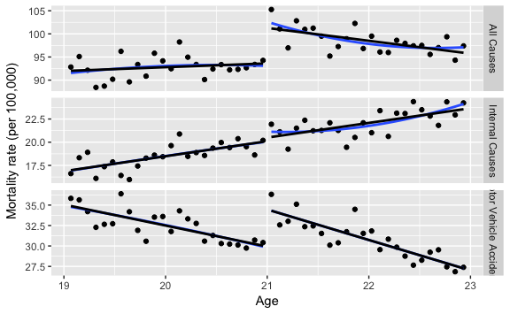 For “all causes”, “motor vehicle accidents”, and “internal causes” deaths plot the linear and quadratic trends on each side of age 21.