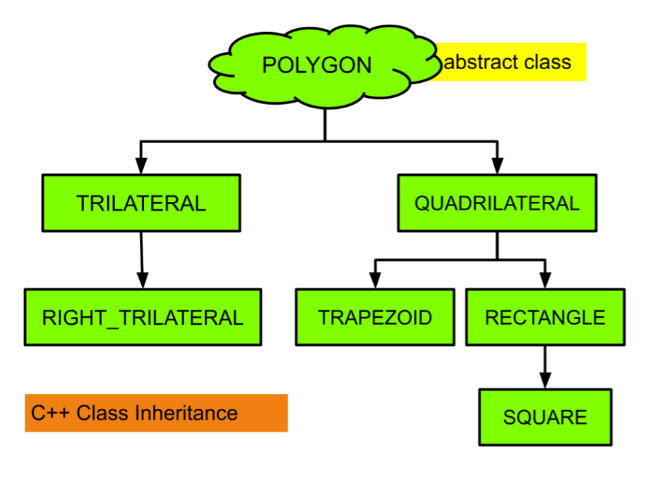 The program implements user defined data types for instantiating POLYGON type objects (and POLYGON is an abstract class) which are instances of either the POLYGON-derived non-abstract class named QUADRILATERAL or else the QUADRILATERAL-derived non-abstract class named TRAPEZOID or else the QUADRILATERAL-derived non-abstract class named RECTANGLE or else the RECTANGLE-derived non-abstract class named SQUARE or else the POLYGON-derived non-abstract class named TRILATERAL or else the TRILATERAL-derived non-abstract class named RIGHT_TRILATERAL.