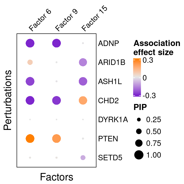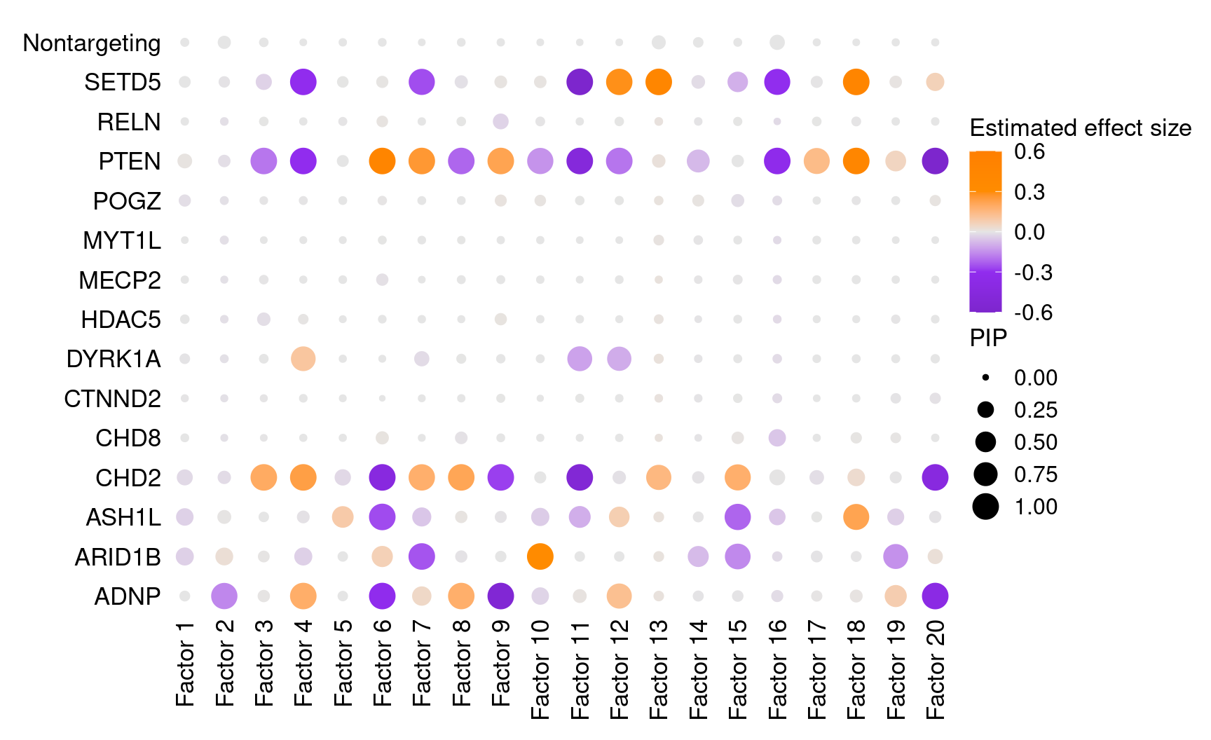 We found that targeting of 7 genes, ADNP, ARID1B, ASH1L, CHD2, DYRK1A, PTEN, and SETD5, has significant effects (PIP > 0.95) on at least 1 of the 20 inferred factors.