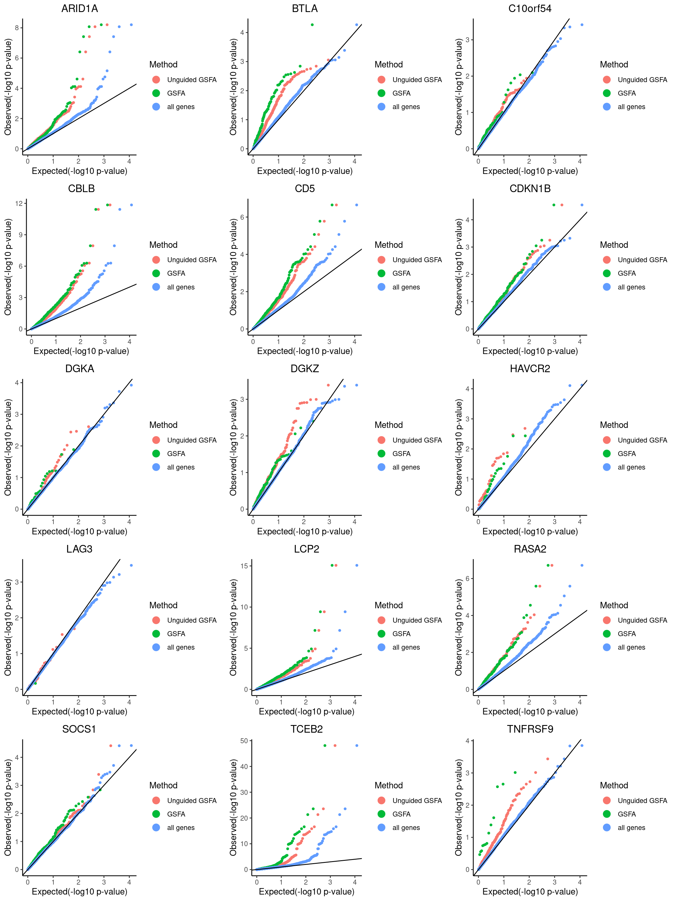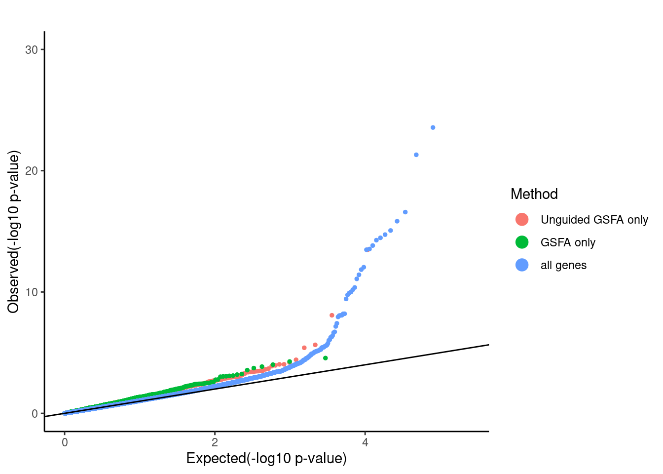 QQ-plots of MAST DE p-values for the GSFA genes vs unguided GSFA genes.