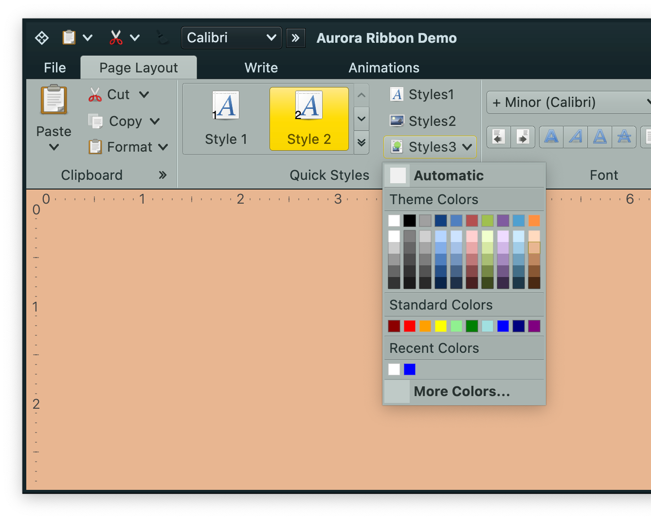 A projection of a color selector command is a popup button ("Styles3" button in the screenshot above) that displays a popup menu with regular commands and additional, optional three color selector panels: