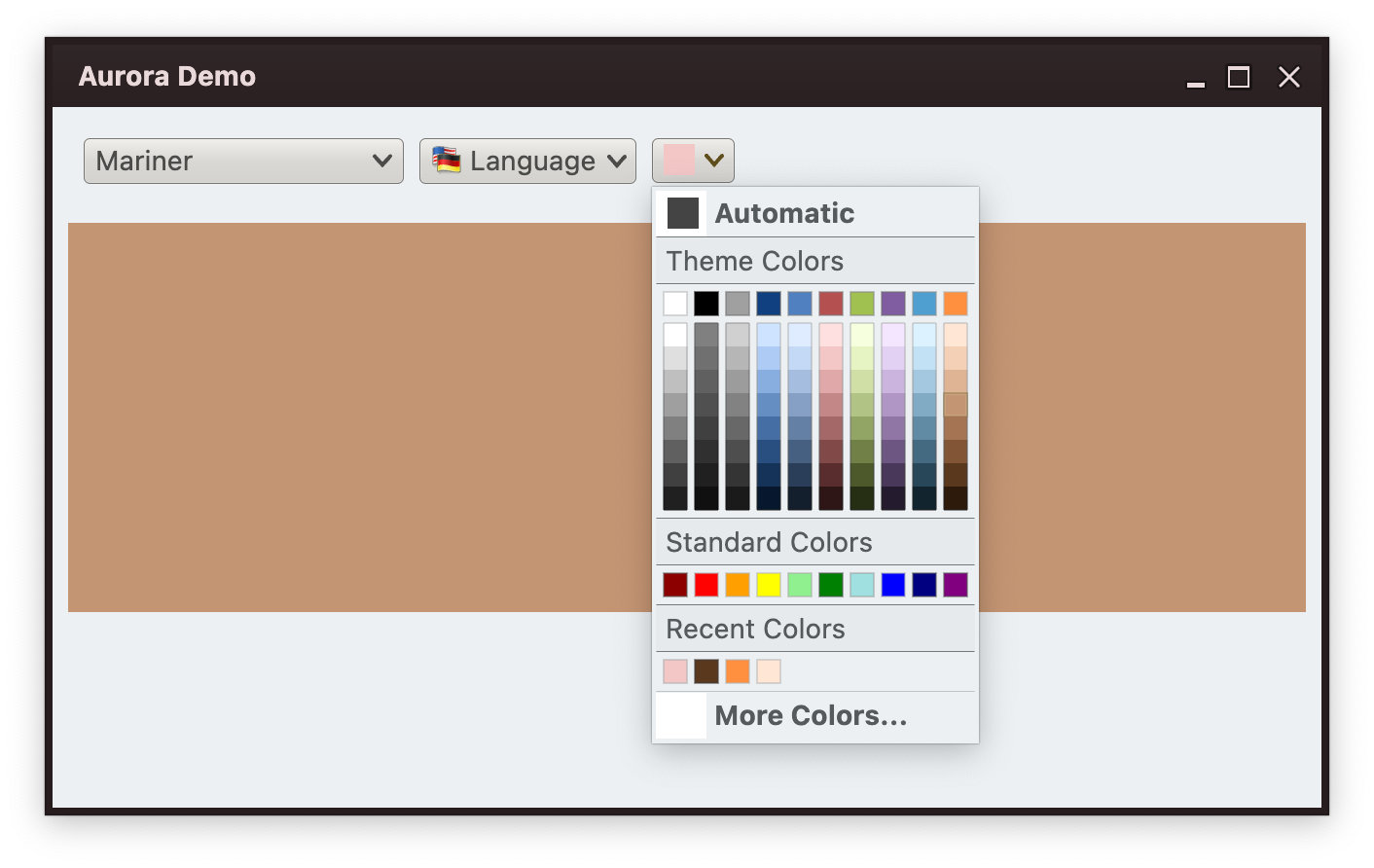 - We have a small popup button that displays a color selector popup menu with five sections - "automatic" with hard-coded color, a grid of color selector cells based on "theme" colors, a single row of "standard" colors, another row of "recent" colors and a command that brings up a `JColorChooser`.