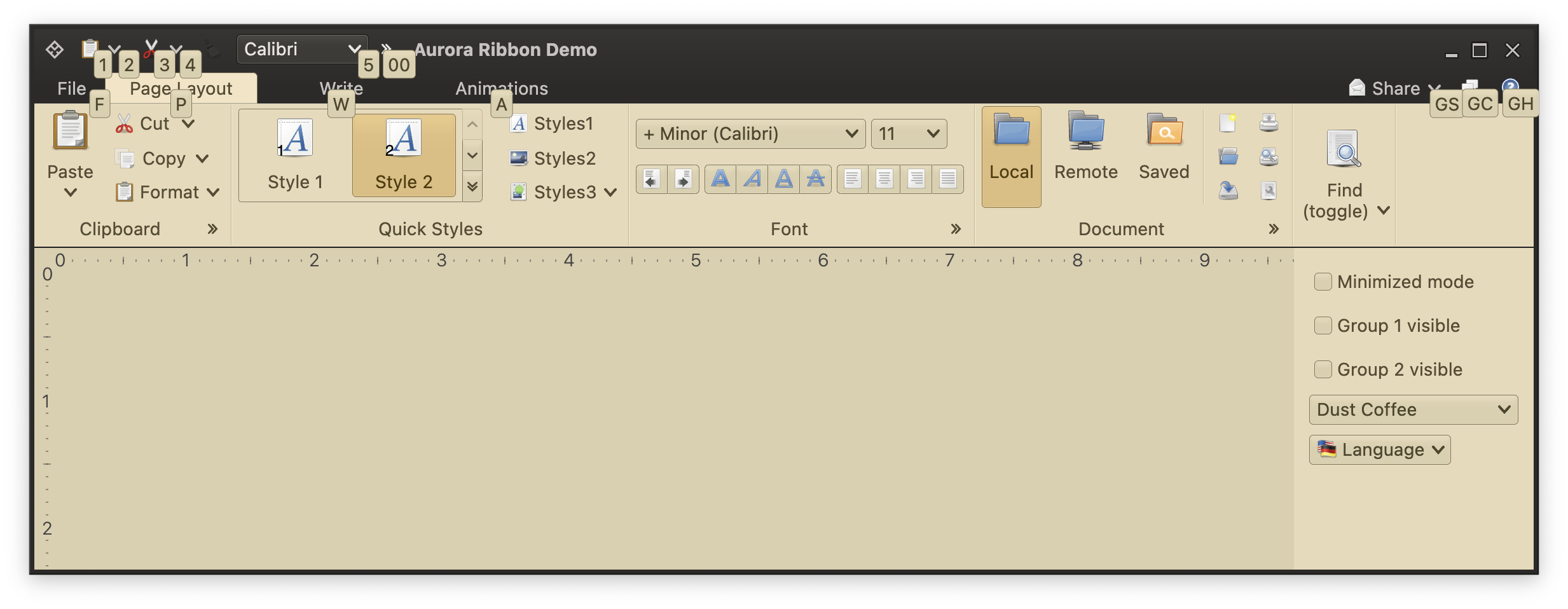 Unlike the anchored command area, the taskbar is much more versatile. Any element in the ribbon can be added to the taskbar. In the screenshot above we see a small button for the "Paste" command (which has main action and secondary content rendered as a popup menu), another small, disabled button for one of the formatting commands, and a full combobox with the available font selection.
