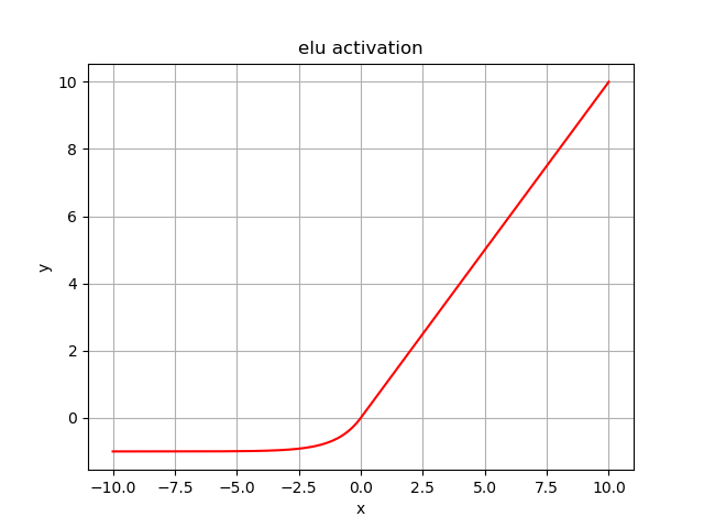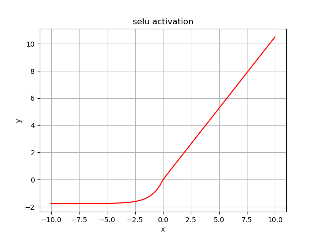 函数表达式: \(y = \lambda \left\{ {\begin{array}{ccc}{x,\;\;\;\;\;\;\;\;\;\;\;\;\;x \ge 0}\\{\alpha ({e^x} - 1),\;\;\;\;x < 0}\end{array}} \right.\)