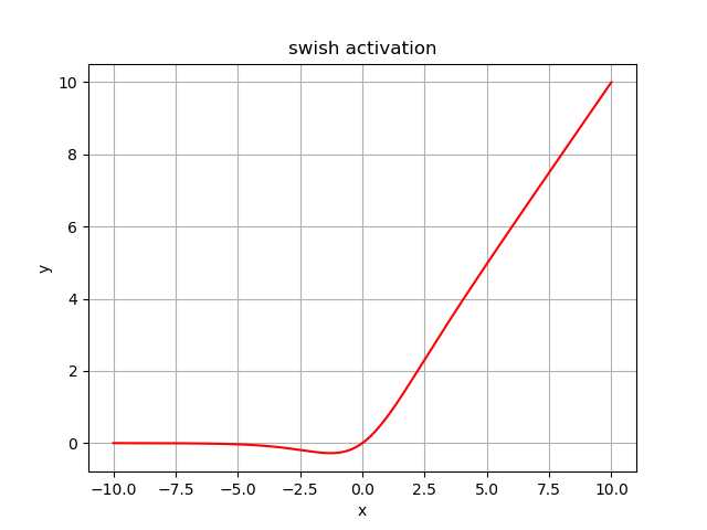 函数表达式: \(y = x\cdot {\rm sigmoid}(\beta x) = {e^{(\beta x)} \over {e^{(\beta x)} + 1}} \cdot x\)