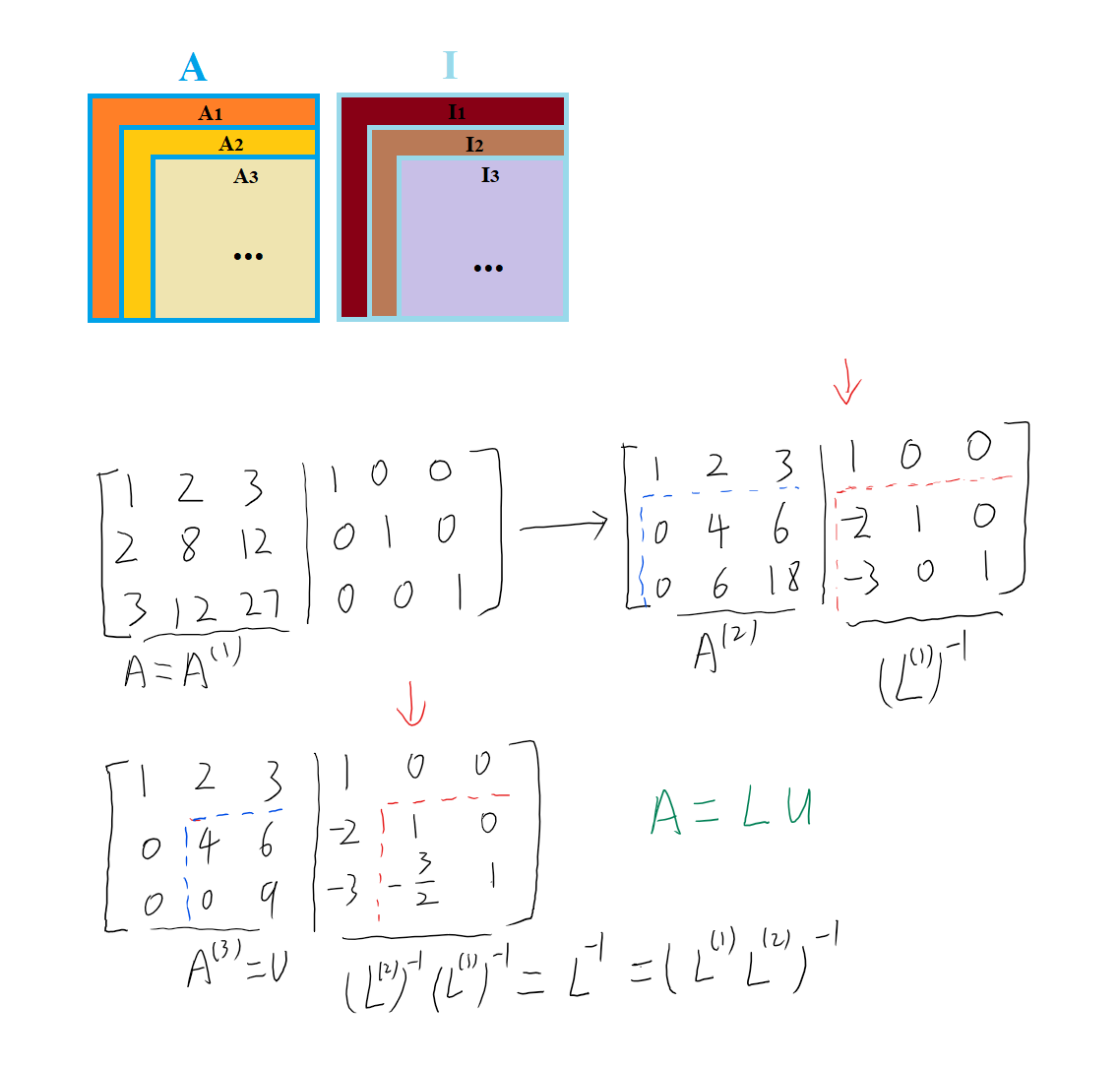 如此循环往复, 将矩阵 \({\bm A}\) 的主对角元素下的元素全部化为0, 矩阵 \({\bm A}\) 化为上三角矩阵 \({\bm U}\) , 矩阵 \({\bm I}\) 变为单位下三角矩阵的逆 \(({\bm L}^{(n-1)}\cdots {\bm L}^{(2)}{\bm L}^{(1)})^{-1} = {\bm L}^{-1}\) .