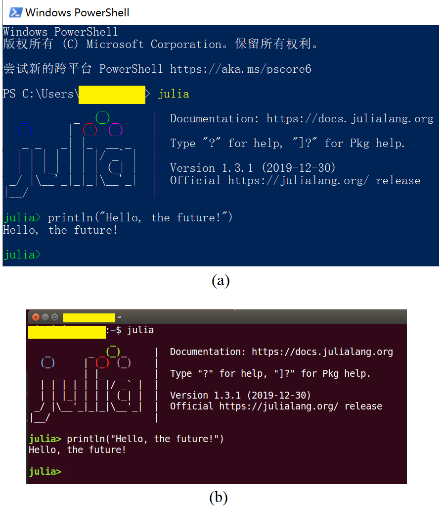 图 7.3 Welcome interface of Julia on Windows and Ubuntu¶