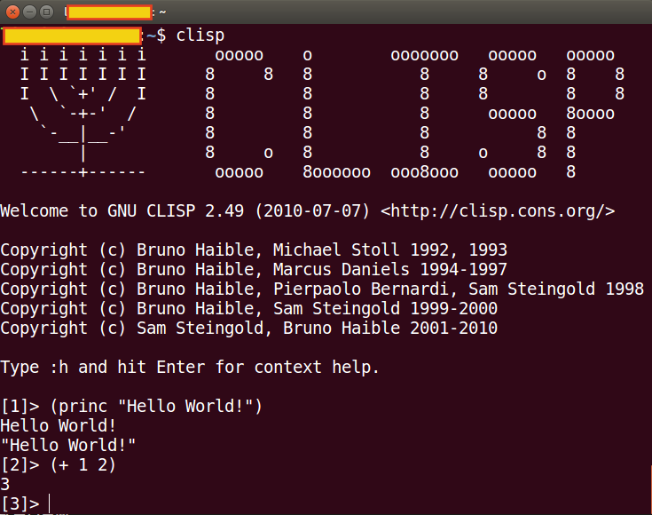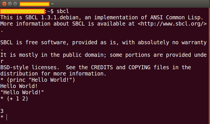 Ubuntu上安装SBCL十分简单, 只需通过执行命令 sudo apt install sbcl 即可安装, 安装完成后, 终端输入 sbcl 即可进入交互界面, 如 图 4.4 所示.