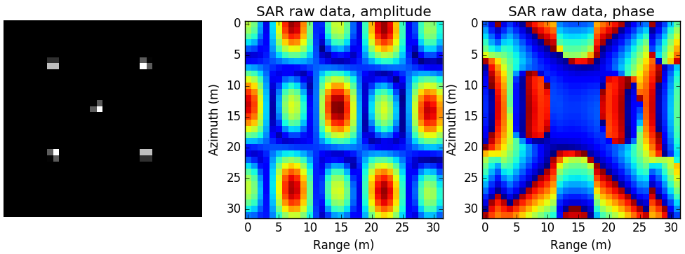 图 4.55 仿真点目标场景图, 仿真SAR原始数据幅度相位图¶