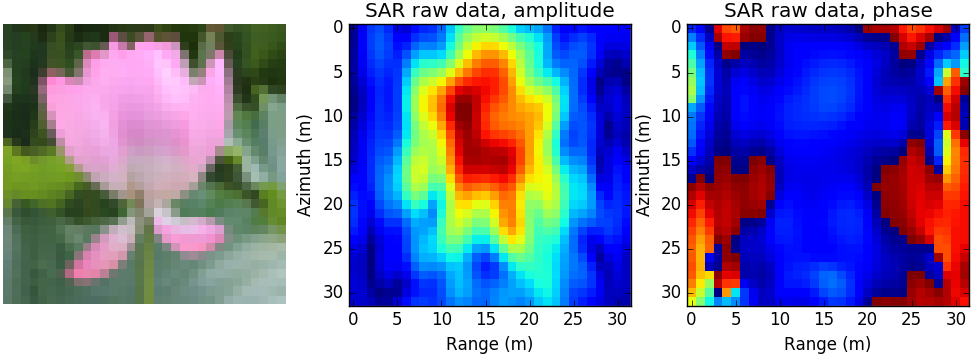 图 6.20 仿真荷花场景图及仿真生成点SAR原始数据幅度与相位图如下¶