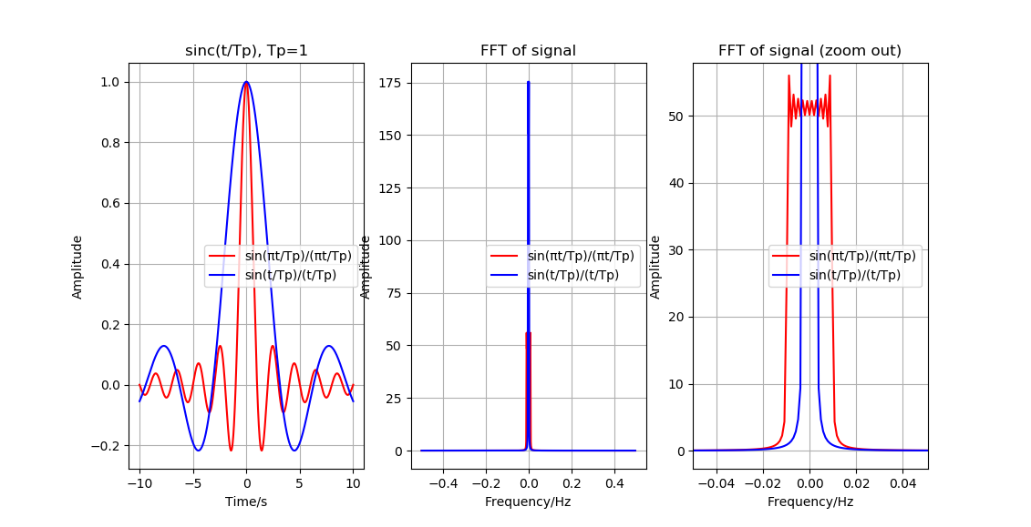 其中, \(T\) 为采样间隔, \({\rm sinc}(t) = \frac{{\rm sin}(\pi t)}{\pi t}\) 称为归一化的 \({\rm sinc}\) , 与数学中定义的 \({\rm sinc}(x) = \frac{{\rm sin}(x)}{x}\) 不同.