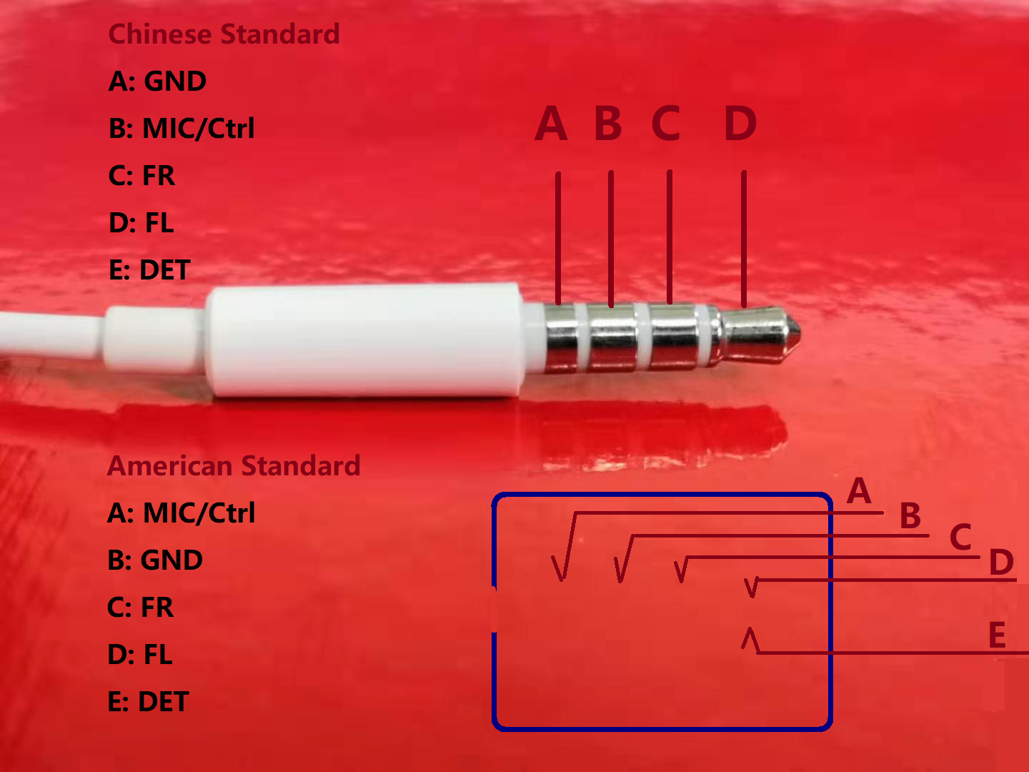 常见的四线式耳机接口一般有两种标准, 中国标准和美国标准, 不同的只是地线(GND)与麦克线(MIC)的顺序.