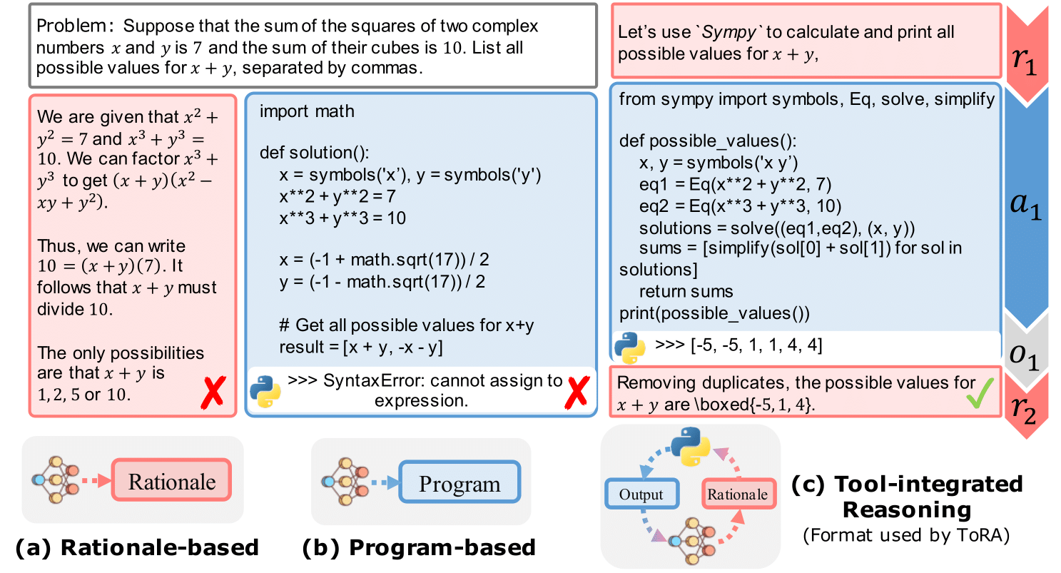 ToRA is a series of Tool-integrated Reasoning Agents designed to solve challenging mathematical reasoning problems by interacting with tools, e.g., computation libraries and symbolic solvers. ToRA series seamlessly integrate natural language reasoning with the utilization of external tools, thereby amalgamating the analytical prowess of language and the computational efficiency of external tools.
