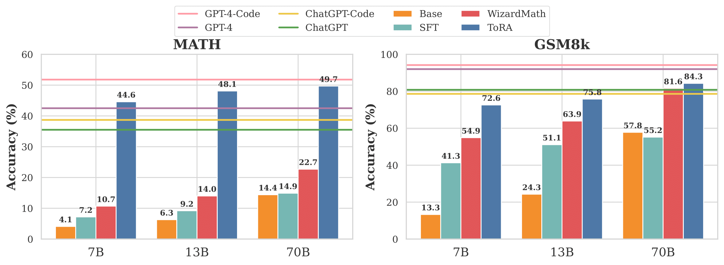ToRA-70B](https://huggingface.co/llm-agents/tora-70b-v1.0) | 70B | **84.3** | 49.7 | **76.9** |