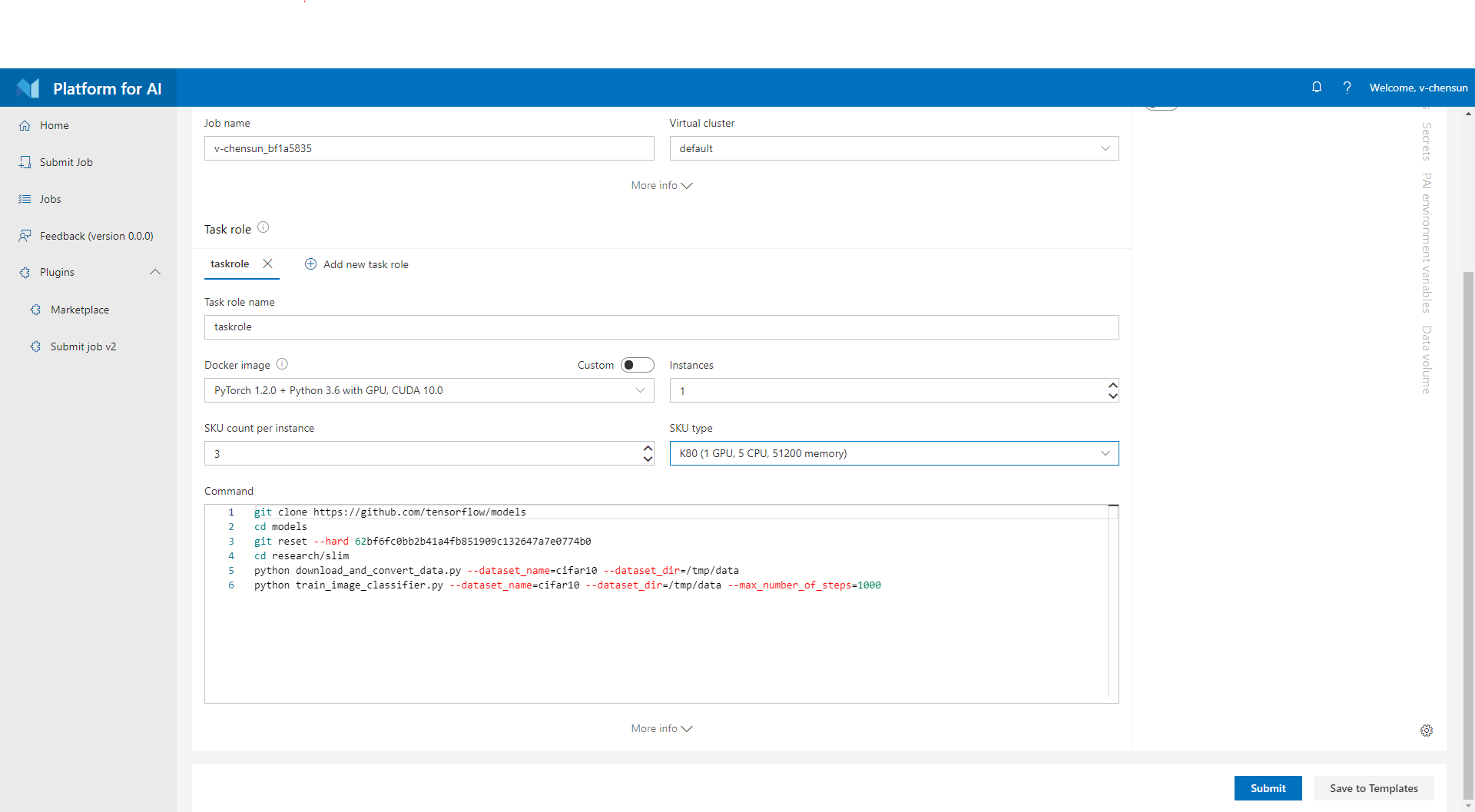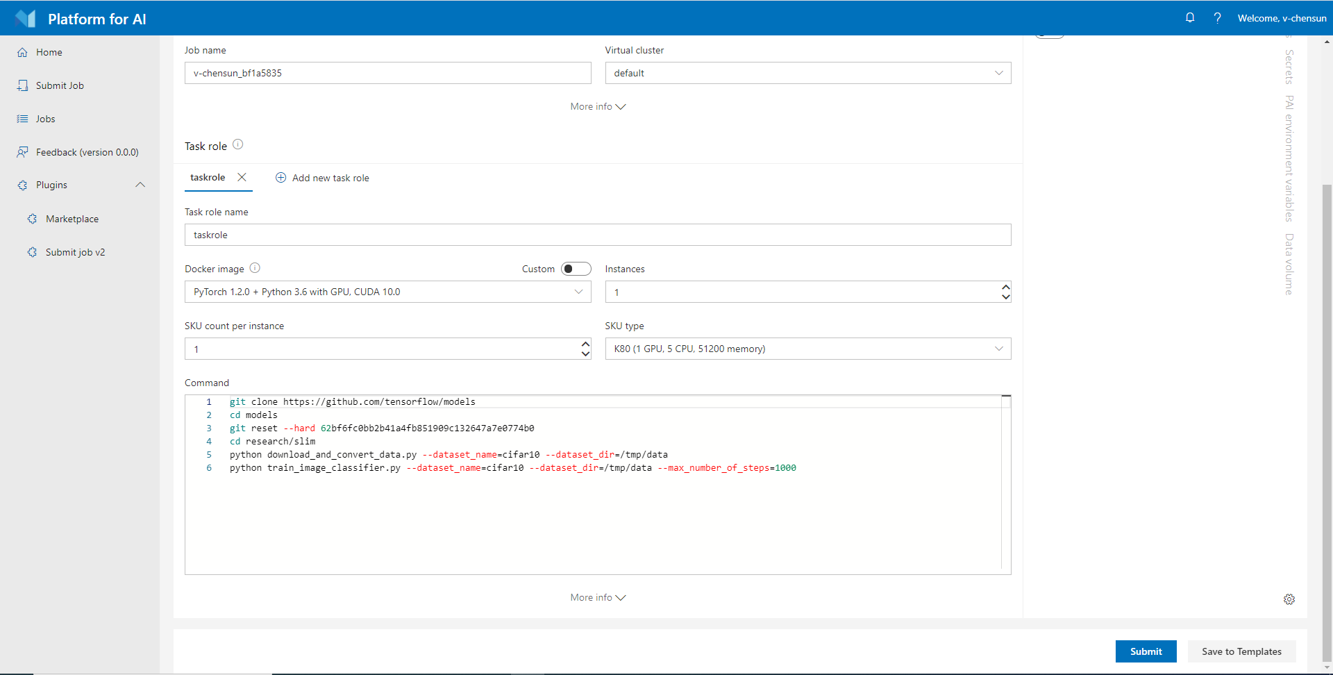 **Step 3** Select your virtual cluster, and give a name for your job. Then copy the following commands into the command box.