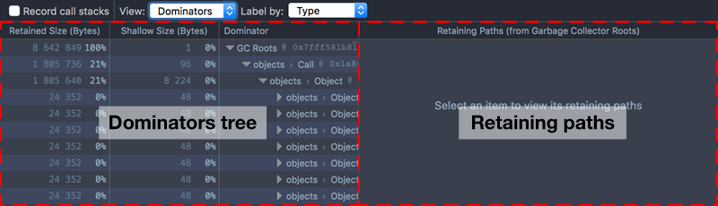 To see the Dominators view for a snapshot, select \"Dominators\" in the