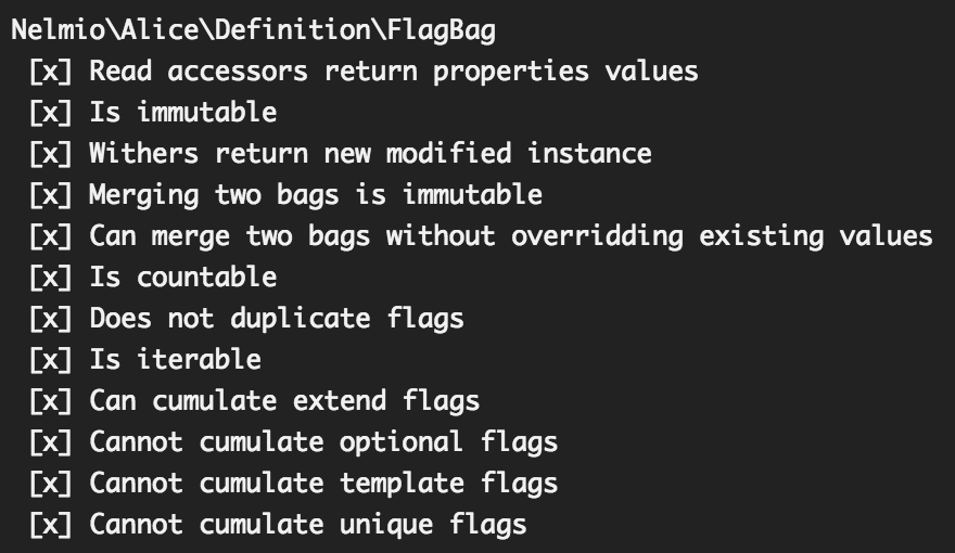 The tests should be descriptive and are "testdox friendly" i.e. if you are using the testdox