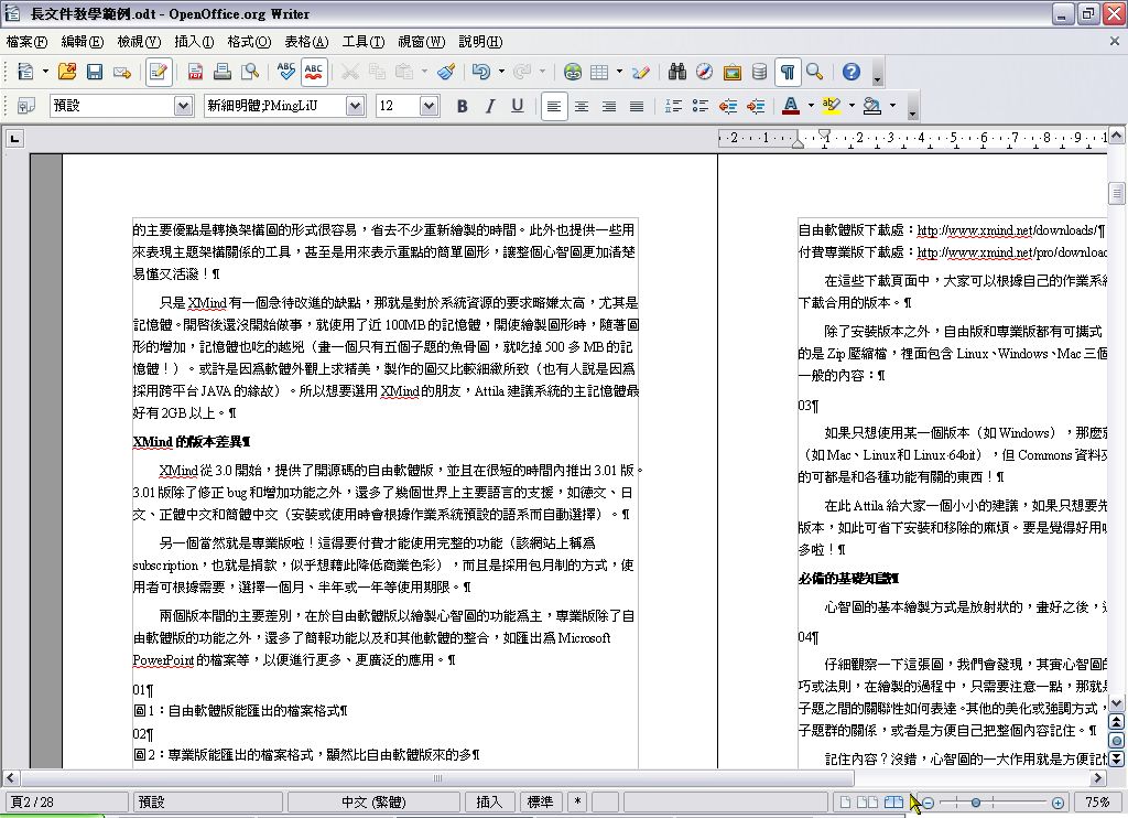 在右下角的「檢視版面配置」,按二下「書籍模式」,然後縮小檢視比例,切換到第二頁以後,我們會看到頁的外緣比內緣還窄,二者之間的差距,正是用來作為裝訂之用的。