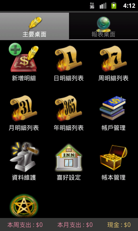 除了〔主要桌面〕的各種明細列表外,點選主畫面上方的〔報表桌面〕,便可找到三款報表,包括〔單月份結算〕、〔單年結算〕及〔累計結算〕。