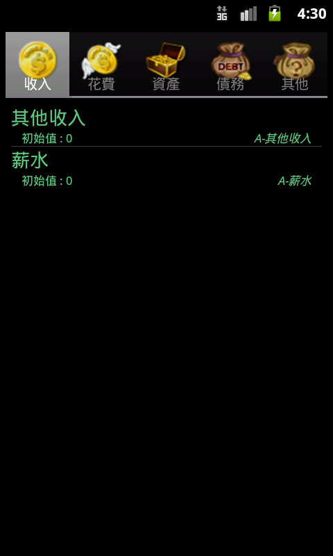 使用者可點選畫面上方的不同帳戶類別,觀看該類別之下有什麼帳戶項目。軟體已預設建立兩個屬於「收入」類別的帳戶,分別是「薪水」及「其他收入」。再點選畫面上方的〔資產〕,便會看到以下的畫面。
