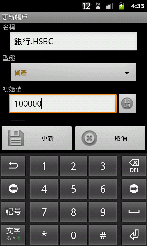 接下來就是逐一輸入使用者所有銀行戶頭的初始值(亦即為結餘)。點選其中一個「銀行」帳戶,便可進入該帳戶的編輯介面,同樣在「初始值」欄位中輸入使用者現在該銀行帳戶的結餘。當然,使用者可隨意修改帳戶的名稱,畢竟並非所有人都有 HSBC 或台灣銀行戶頭。