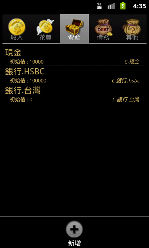 資產:使用者所擁有的銀行帳戶,以及手上的現金等。