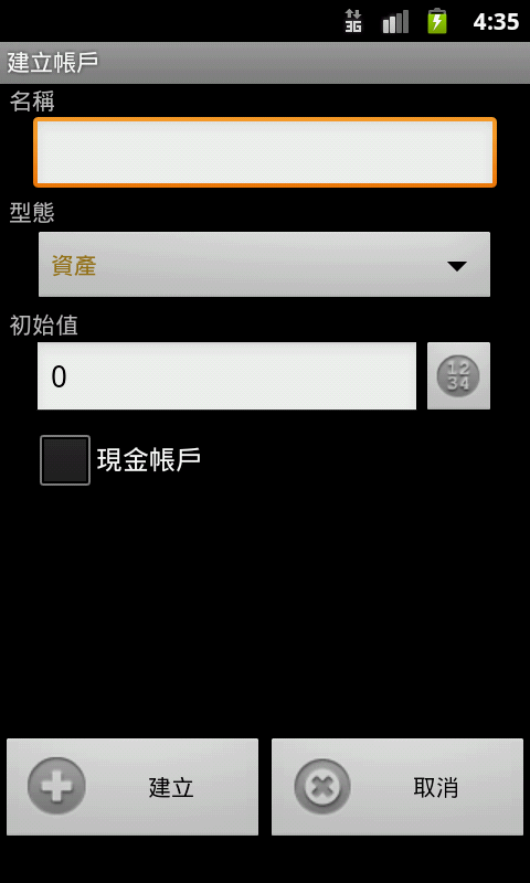 上圖就是帳戶「現金」的編輯介面。使用者可以隨意修改帳戶的名稱,以及在「初始值」欄位中輸入使用者現在手上所持有現金的總額。例如使用者現在手持 10,000 元,那麼就在「初始值」欄位中輸入「10000」。