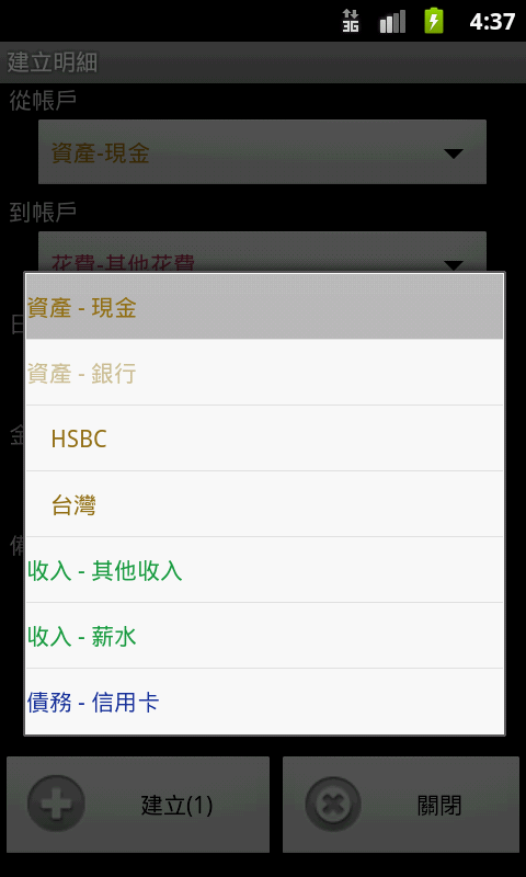 使用者點選將薪水存入的銀行,例如圖中的「資產-銀行」下方的「HSBC」。「從帳戶」及「到帳戶」都設定了,再選擇這項交易的「日期」以及金額(「金錢」)。最後點選「建立」,便完成建立明細的程序。