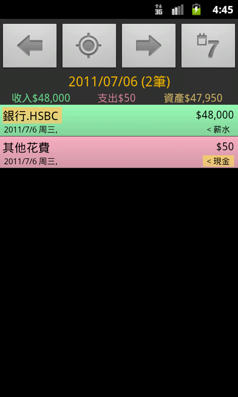 透過 daily-money 的主畫面點選〔日明細列表〕,便會看到以下的畫面。這個「日明細列表」可列出在指定日期裡的所有交易。點選列表中某一個明細項目,就能進入該明細項目的編輯畫面。