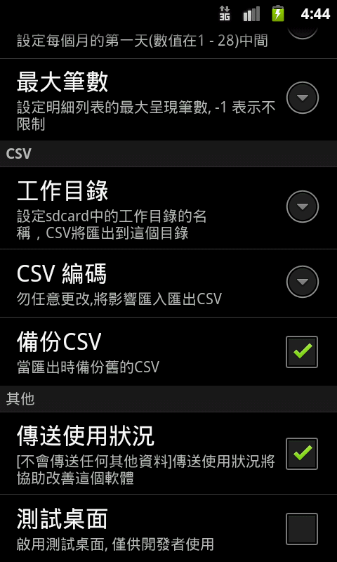 使用者如有需要,可將這個軟體的所有資料備份至 Android 智慧型手機裡的 microSD 卡。透過〔主要桌面〕中點選〔資料維護〕,再點選〔匯出 CSV〕,便可將所有資料匯出成 CSV 檔案,並儲存於 microSD 卡。亦可透過〔主要桌面〕中點選〔喜好設定〕,自行設定 CSV 備份檔案的儲存位置。