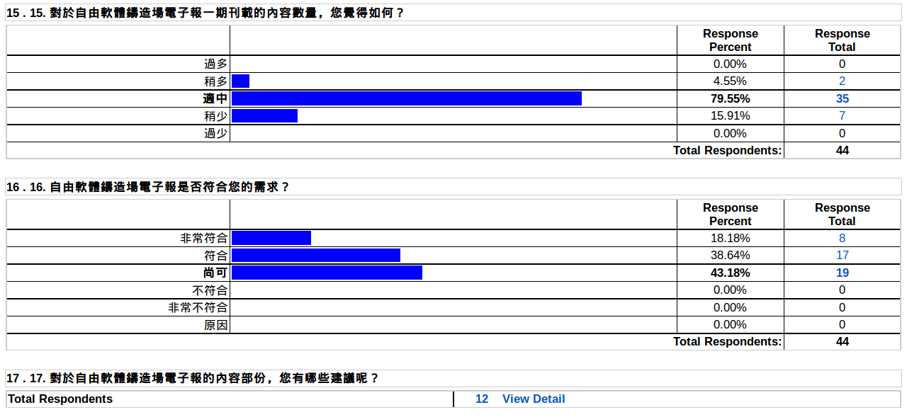 根據第 16 題的數據,選擇 [符合] 與 [非常符合] 的讀者比例大約佔 57%,表示有超過半數的讀者都認為本電子報很符合他們心中的期待。雖然如此,電子報編輯們仍覺得選擇 [尚可] 選項的讀者的意見非常的重要,這會是讓我們更進步的動力,因此接下來,我們會針對第 17 題讀者給的寶貴建議做回應。