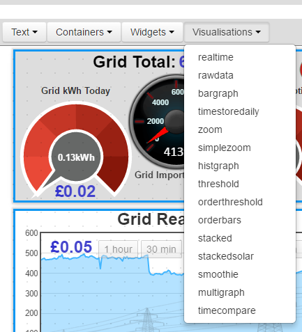 Add Visualisation water zoom (Solved)Submitted by smitt1979 on Wed, 27/04/2016 - 23:30Hi I been working a new Visualisations zoom to display water in Litres i have it working but I’d like to add it to my dashboard but it not display in the Visualisations dropdown does anyone know how I can fix this Steve Water Zoom