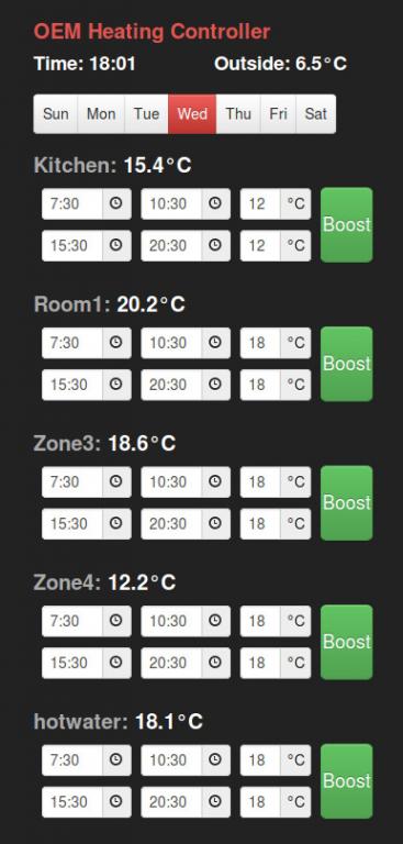We've removed the day buttons from the left, they are now on the top, good progress on it today, most of the work on functionality rather than interface design, there's some initial notes on how to get the scheduler module running in the build guide page: Heating controller with multi zone scheduling