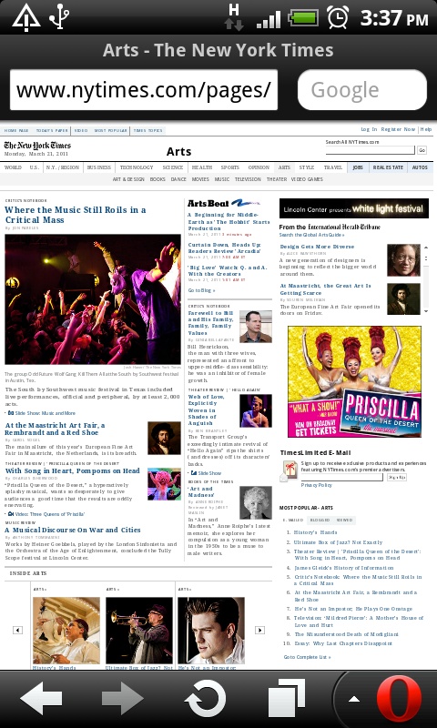 If the page loaded is wider than 980px, such as for instance www.nytimes.com (see Figure 1), Opera Mobile goes to some extra effort, making the viewport a little wider so as to make sure the parts that would otherwise fall out of the 980px are included as well. The result is then scaled down so the page fits nicely inside the available screen area.
