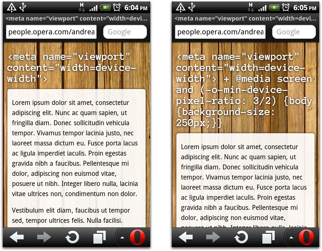 Figure 6: two HTC Desire screenshots, with on the left, our earlier example with just width=device-width — note the magnified and somewhat pixelated background; on the right, an example with added device-pixel-ratio goodness, which results in much nicer, DPI-aware background image tiling.