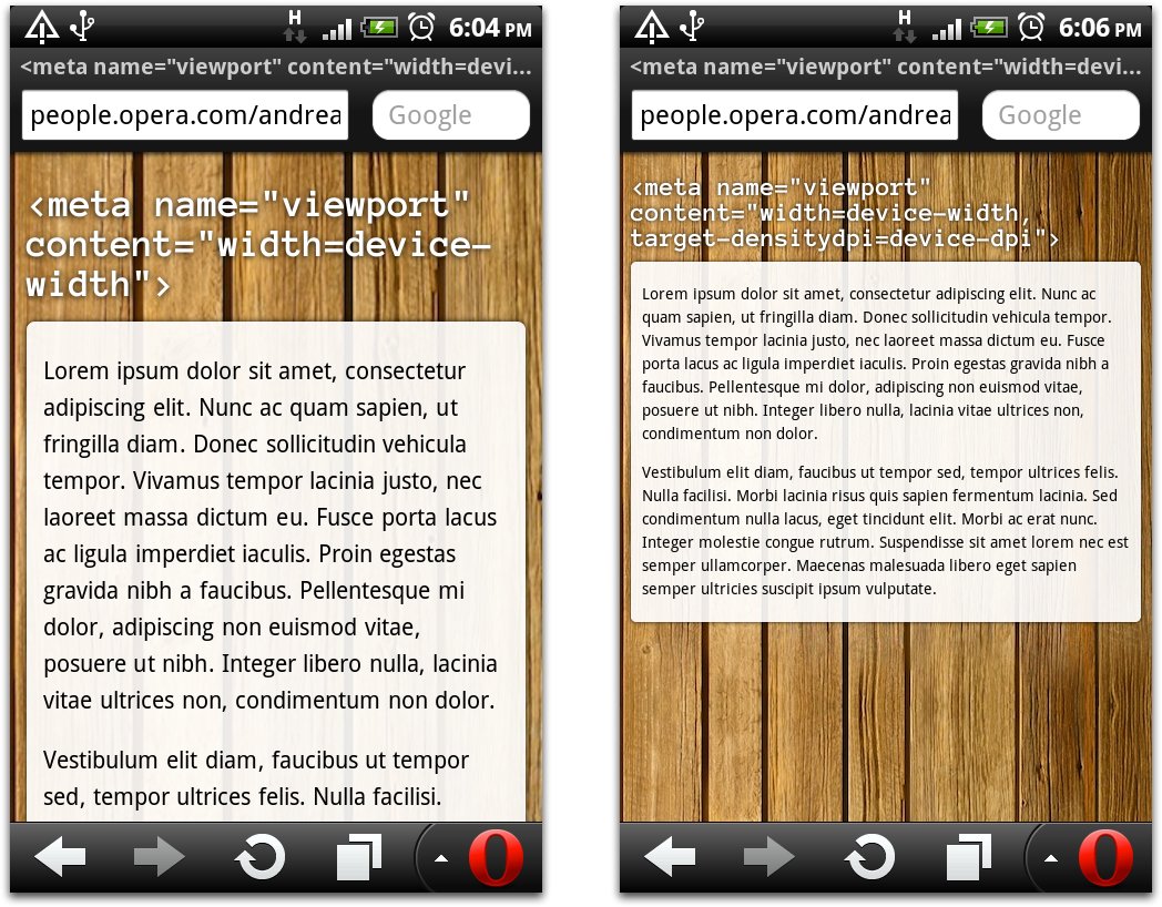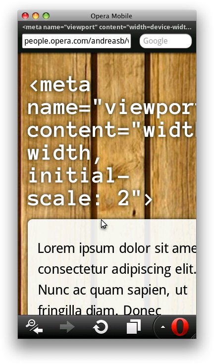 Support for the viewport meta tag in Opera’s mobile products has been around for quite some time, and from Opera Mobile 11 onward, we have made our viewport implementation more robust, added support for new mechanisms to deal with different screen densities, and included an implementation of our own CSS @viewport rule proposal. In addition, Opera Mini 6 and later now also comes with basic support for the viewport meta tag.