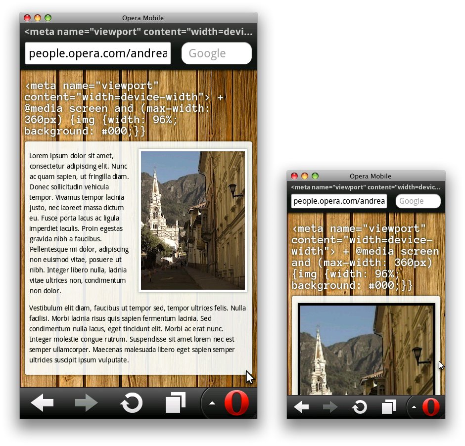 This will give the page a viewport equal to the screen’s width — it will scale up the page content accordingly — and trigger our media query to be applied on devices that are as wide or narrower than 360px. Opera Mobile running on the Nokia 5800 (which is 360px wide in portrait mode) will thus show the images at 96% of their container, just like Safari on the 2nd gen iPod Touch (which is 320px wide). A screen with a 480px width however will not apply the media query (see Figure 5).
