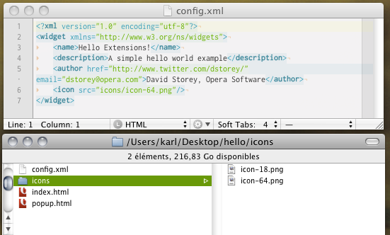 Let's take the hello world extension example created by David Storey, Opera Software. The file structure and the related config.xml is shown below in the figure 1. We can notice the icons in two sizes: 18 pixels and 64 pixels.