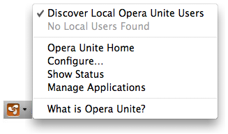 - Configure…: Opens the Opera Unite Settings dialog, if you need to reconfigure your settings