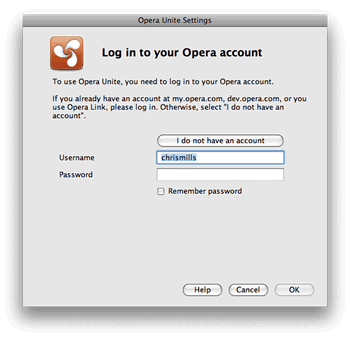 A number of Opera Unite applications come preinstalled in Opera 10.10, as you can see listed in Figure 1. To run one, simply double-click on the application (I’ll choose Media Player for now). If this is your first time running Opera Unite, you’ll see the Opera Unite Settings dialog box, which will prompt you to log in to your Opera account — see Figure 3.