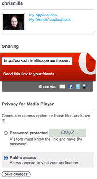 http://admin at the beginning of the URL, ie >http://admin.mymac.chrismills.operaunite.com/media_player/, you can access the administration page for the application, which allows you to alter security settings, etc. But only if you are the person running the applications. You’ll need an admin password if you try to access this from a different computer to the one running your applications (this can be got from the Unite Home Page — see later on). You will get to the admin page automatically upon running the application if you are using the Opera Unite browser the applications are running in, but in this case, you probably are the administrator!
