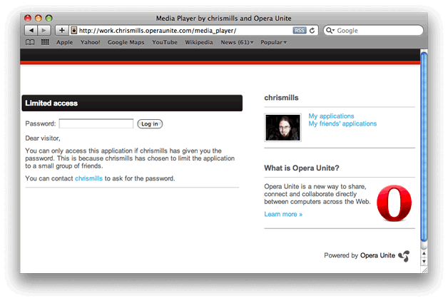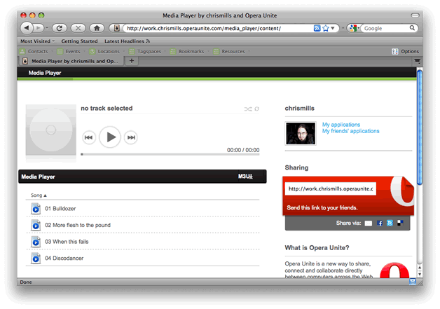 Opera Unite uses a special URL system. To identify your computer uniquely in the system, it uses the name you chose for your computer, followed by your unique identifying name, followed by the standard server domain, for example http://mymac.chrismills.operaunite.com/media_player/ . In this case the device running Opera Unite has been called mymac (you can have multiple devices under one user name), and the user name logged in to Opera unite is chrismills.