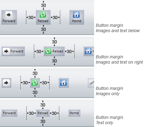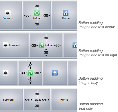 Specifies the padding around the text labels of buttons added to create some space between the text and their corresponding images. This setting applies to all elements and is cummulative with spacing, which can also be set for any element individually.