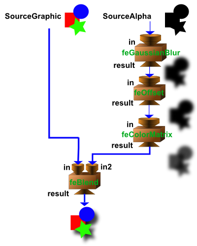 I like to think of filter primitives as pluggable components. Each filter primitive has zero or more inputs and one output, that can be hooked up (or "chained") to other primitives. See Figure 1. The behavior of each filter primitive is controlled by attributes as described in the SVG specification.