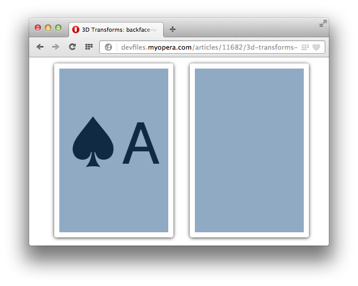 As mentioned above, at any given time a real playing card has a face you can see and a face you can't. The face you can't see is known as its back face. With 3D transforms, we can control the visibility of this back face using the backface-visibility property. Valid values are visible and hidden. Back faces are visible by default.