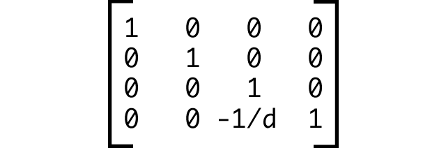 Consider the perspective projection matrix from above. If we apply a perspective transform of 200 pixels — transform: perspective(200px) — our distance or d value is 200. We can then divide -1 by 200 to arrive at -0.005. In other words, transform: perspective(200px) is the equivalent of transform: matrix3d(1, 0, 0, 0, 0, 1, 0, 0, 0, 0, 1, -0.005, 0, 0, 0, 1).