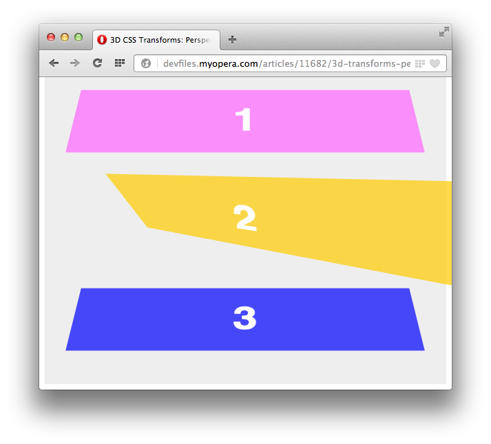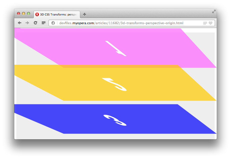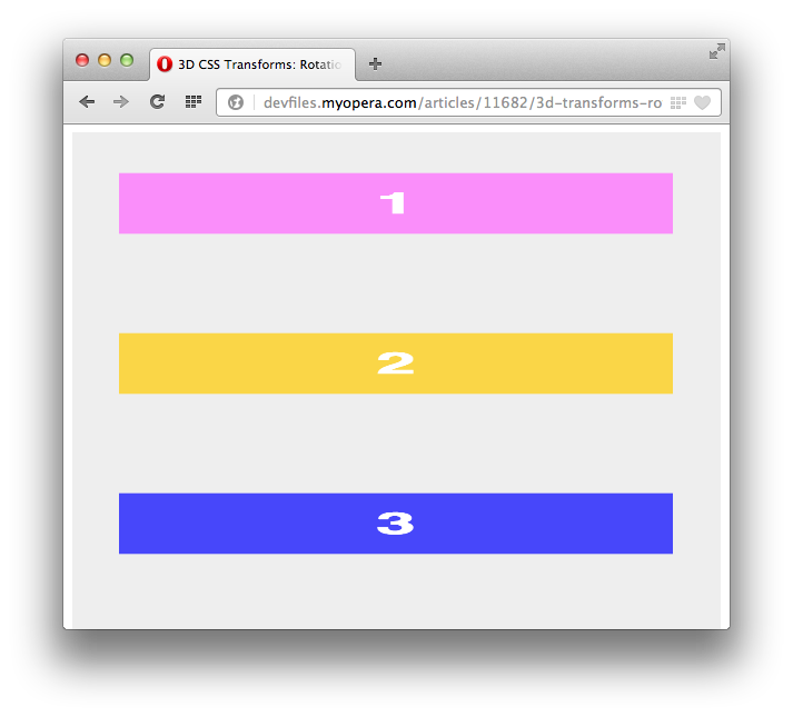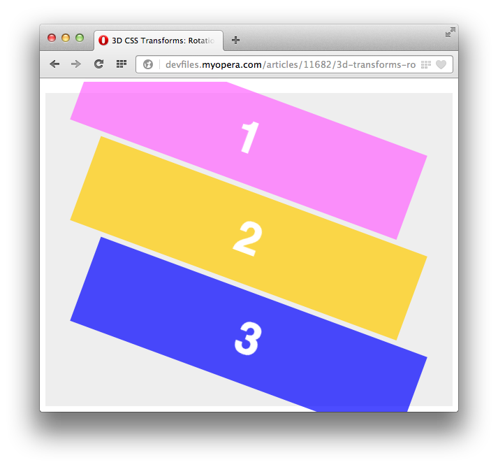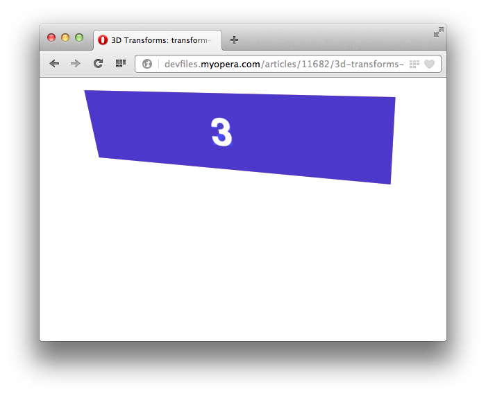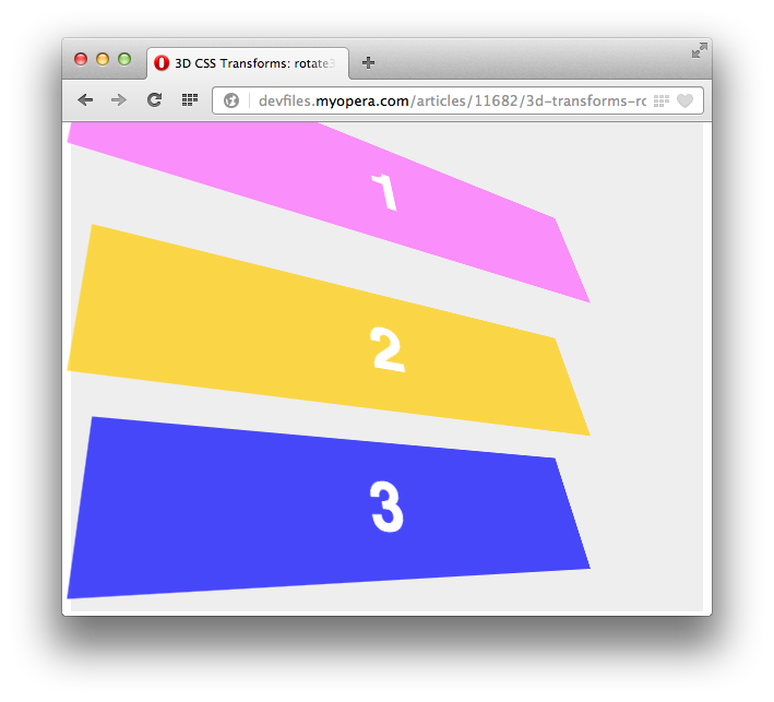 Opera 15 adds a lot of goodies under its hood, including three-dimensional CSS transforms (2D transforms have been available since Opera 10.50). In this article we'll dig in to 3D transforms in detail, looking at the fundamental differences between 3D and 2D transforms, the 3D transforms available, and some demos that show how these work.