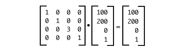 Figure 12: We're multiplying a 3D scaling matrix — the equivalent of scaleZ(3) by the coordinates of a point at (100,200,0).
