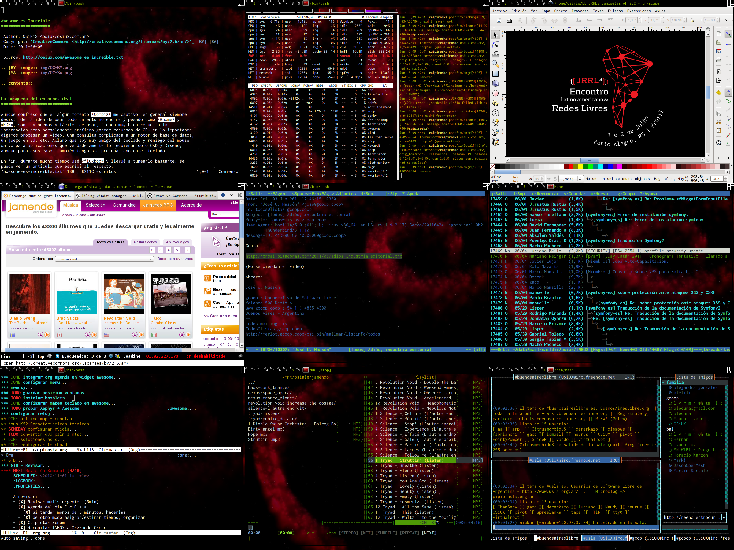 la agenda emacs org-mode, el reproductor de música mocp, el cliente de